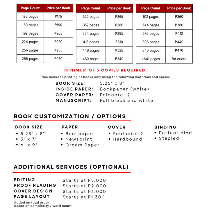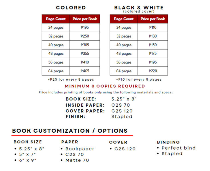 This is the basic specifications you can have for our book printing services.To fully customize your book, change the materials used to print your work, and for other requests, use the buttons below.